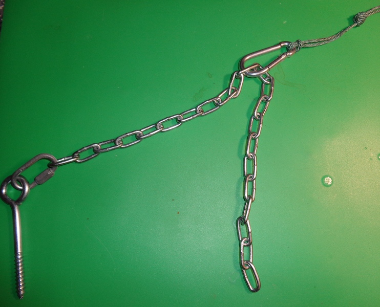 Проблема возни с талрепами растяжек при выравнивании антенной мачты по вертикали знакома всем. Крутить талрепы приходится долго и муторно и не всегда удаётся достичь положительного результата. Рабочий ход даже самого крупного талрепа весьма ограничен. При выравнивании своих мачт давно пользуюсь простой «приспособой». Вместо талрепов использую отрезки цепи длиной 50-70 см. Выбор слабины растяжек производится простым перемещением карабина по звеньям цепи. Всё понятно из фото. И быстро, и диапазон регулировок широкий. Толщина звеньев цепи и размер карабина подбираются исходя из предполагаемых нагрузок. Сварная цепочка с толщиной звена 2 мм уже выдерживает нагрузку на разрыв до 100 кг.